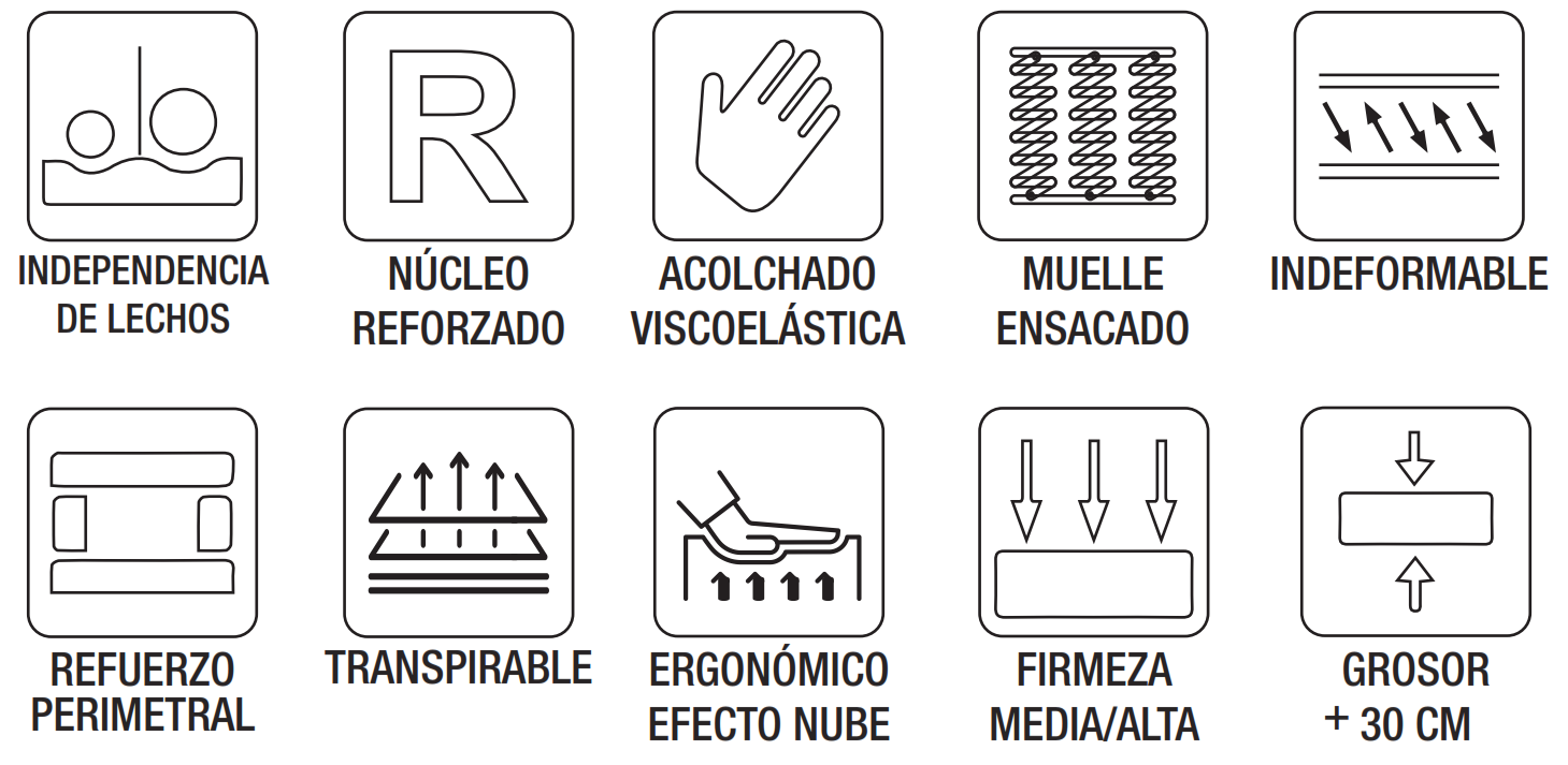 - Muelles ensacados + HR23: independencia de lechos, firmeza y soporte.