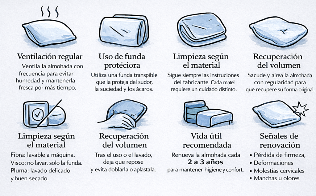 Cuidar correctamente una almohada es clave para alargar su vida útil y mantener su nivel de confort noche tras noche. Además, con unos hábitos sencillos y una rutina de mantenimiento adecuada, la almohada puede conservar su forma, higiene y propiedades durante años. De este modo, garantizas un descanso más saludable y prolongas la calidad del producto sin esfuerzo.
