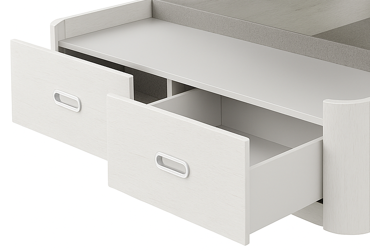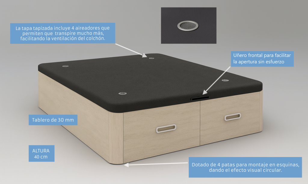 Aquí está uno de sus grandes puntos fuertes: el espacio de almacenamiento. Los cajones ofrecen una solución práctica y accesible para guardar ropa de cama, maletas o cualquier objeto que necesites tener a mano, sin renunciar al orden ni al estilo.