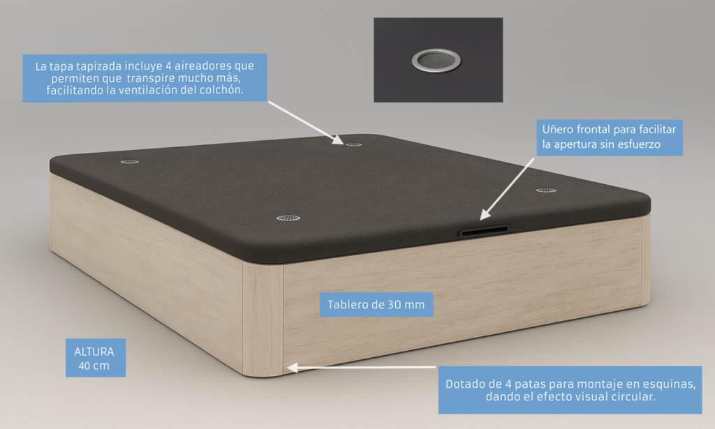El Canapé Plus con apertura lateral destaca por su montaje sencillo y sin complicaciones, además ofrece un acceso cómodo al interior gracias a su sistema lateral. De esta manera, se convierte en una solución práctica para aprovechar al máximo el espacio de tu dormitorio. Asimismo, su diseño limpio y elegante aporta calma visual, mientras que su estructura sólida garantiza la protección y el cuidado de lo que más importa. En definitiva, es la unión perfecta entre funcionalidad, estética y confort.