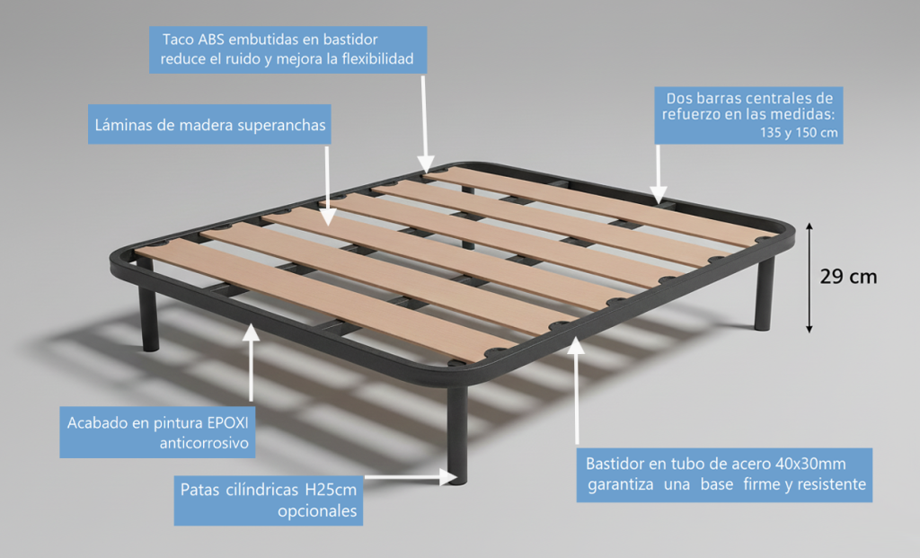 Este somier está diseñado para ofrecer máxima compatibilidad y firmeza en cualquier tipo de cama. Gracias a su estructura metálica reforzada, es perfectamente apta para colocarse sobre travesaños y soportes, garantizando estabilidad y durabilidad en el uso diario.