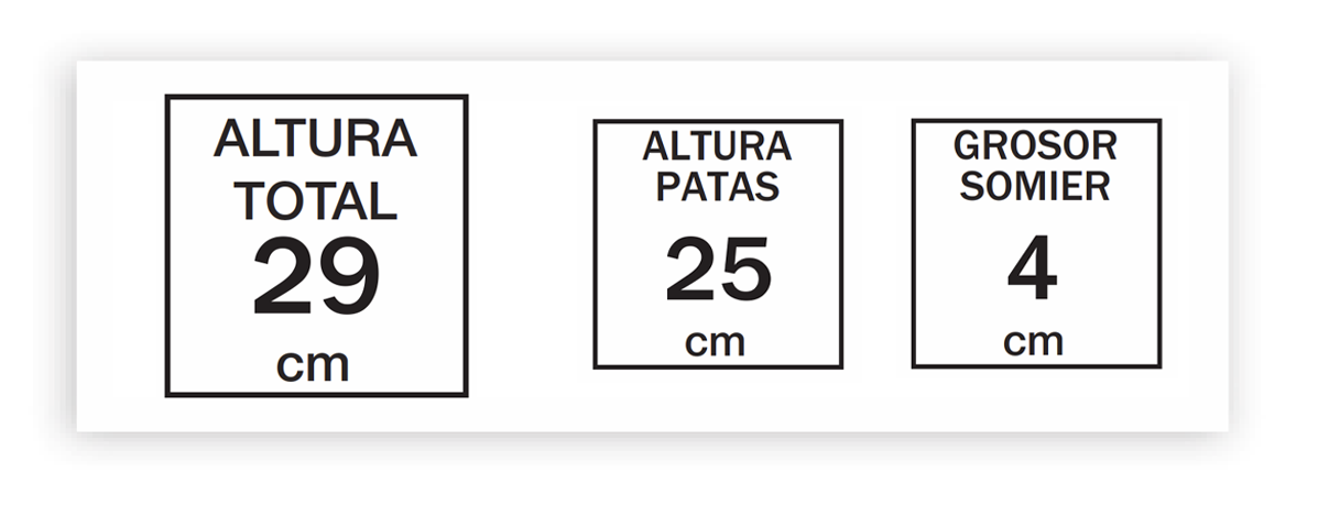Para una mayor personalización, el somier puede adquirirse con patas metálicas redondas de 25 cm de altura. Incluye 4 pletinas en el bastidor para colocar patas roscadas, y 2 adicionales en las barras centrales a partir de 135 cm. Esto permite una instalación segura y estable, adaptada a diferentes configuraciones.