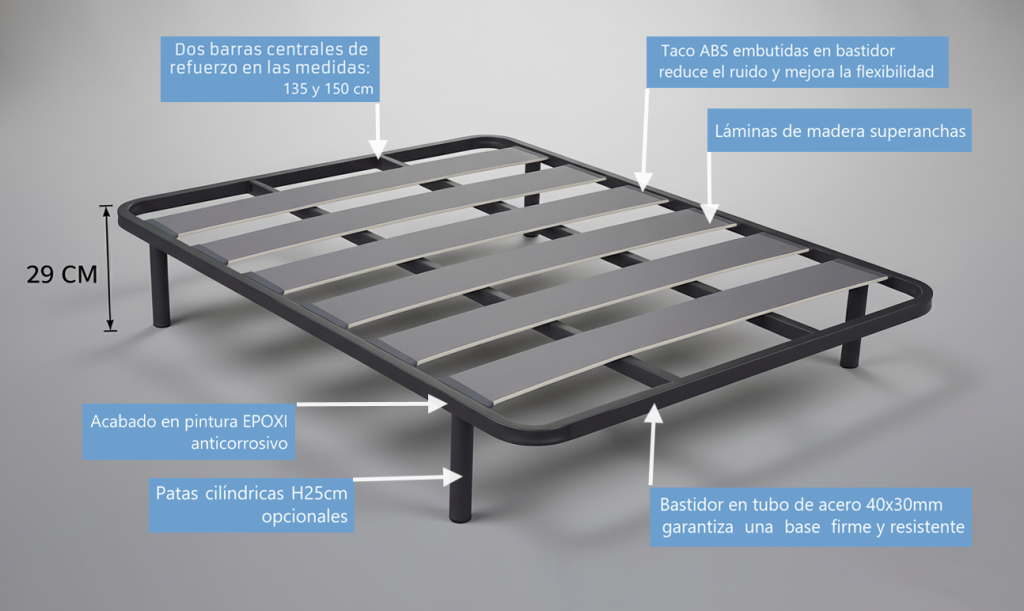 El somier se presenta con un acabado en pintura EPOXI de color negro, resistente a la corrosión y al desgaste. Un toque elegante que combina con cualquier estilo de dormitorio.
